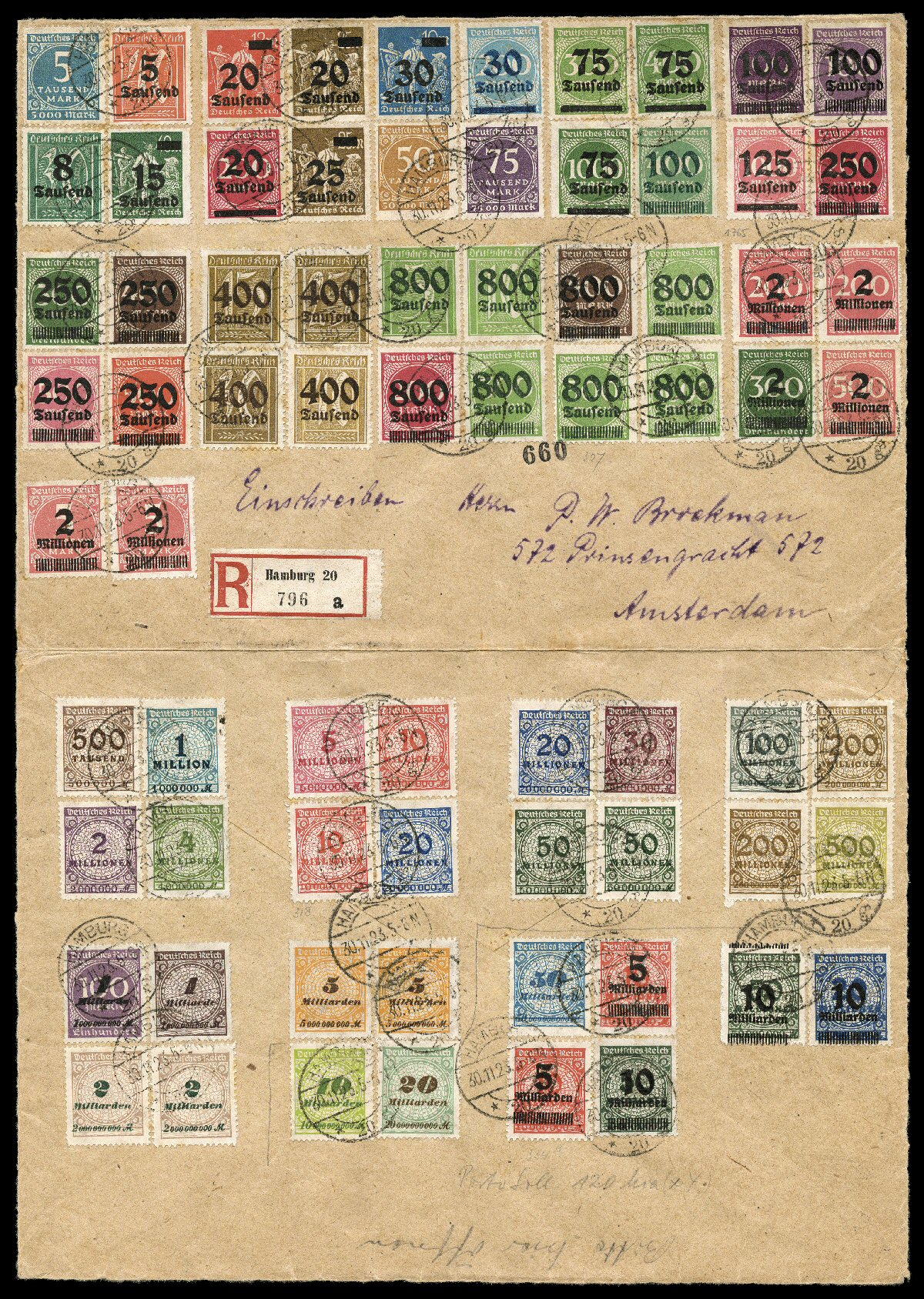 stamps by Hamburg 30.11.23 c.d.s. postmarks, the registry markin#267, 1923 "800 Taufend" on 500M Light green, single tied to large part of a registered cover (the complete front and back opened for display) along with 70 other mostly different stamps by "Hamburg 30.11.23" c.d.s. postmarks, the registry marking "660" also ties the key stamp, fine-very fine; any genuinely used example of this stamp is rare and is particularly desirable on this impressive usage; signed Infla-Berlin and Oechsner (Michel #307; €2,000). (imagea) (Image) $1,250.00+