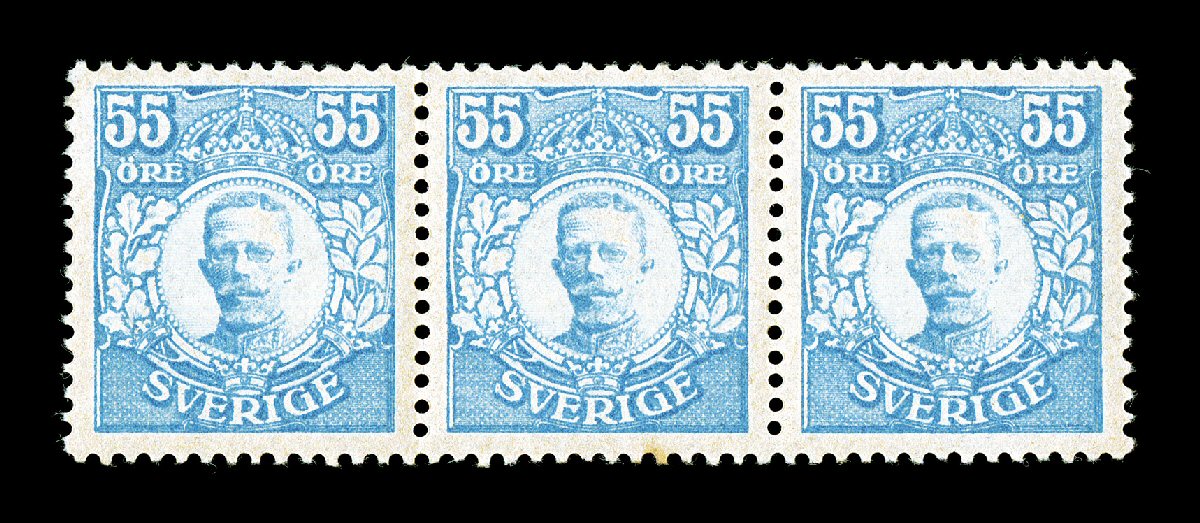printed, each strip incredibly well centered, plus their colors and im#90, 92, 1918 55ö Pale blue and 80ö Black King Gustav V, the two key rarities of the set in wonderfully matching horizontal strips of three each, only 1,000 of each value were printed, each strip incredibly well centered, plus their colors and impressions are prooflike on fresh paper, o.g., the 55ö strip very lightly hinged and the center stamp with a trivial toned perforation tip, the 80ö strip n.h. and perfect in every way, extremely fine; a showpiece set; 1975 Obermüller certificates accompany (Facit #92, 94; 111,000+SEK). (imagea) (Image) $9,300.00+