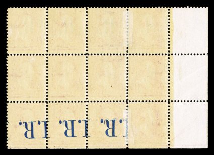 stamps in the bottom row with the overprint printed on the back,#R155d, R155e, 2c Pink, without overprint, a spectacular left sheet-margin block of twelve, with the right three stamps in the middle row with overprint omitted, the right three stamps in the bottom row with the overprint printed on the back, this was caused by the right three bottom stamps having been folded up on the above row prior to overprinting, o.g., some stamps never hinged, fine centering; an amazing multiple for the "I.R." specialist, probably a unique showpiece in this block of twelve, cataloged simply as three vertical pairs, one without overprint (#R155d), plus there is a horizontal pair, one without overprint (#R155e) that is unpriced in Scott, and being in this stunning block will make it even more desirable. (imagea) (Image) $4,500.00+