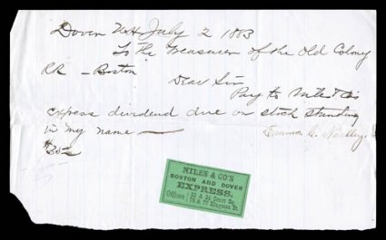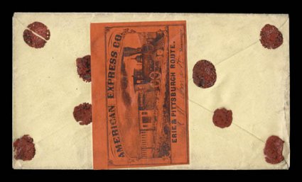 Express Co. (Attica, Ind.) used along with 1c Express revenue stamp on U.SExpress labels on documents, six items, including American Express Co. (Erie & Pittsburgh route) on back of cover, American Express Co. (Lafayette, Ind.) and United States Express Co. (Attica, Ind.) used along with 1c Express revenue stamp on U.S. Express Co. receipt, plus Plummer & Fogg's, Niles & Co's (Boston and Dover), Marshall & Moulton's and Page & Saville's, each on a handwritten note, fine-very fine group. (imagea) (imageb) (imagec) (Image) Est. $500-750