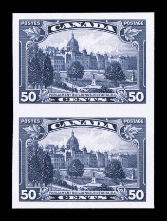 n.h., extremely fine only 75 pairs of each value are recorded (Unitr#247a, 248a, 1939 2c and 3c Royal Visit, imperforate pairs, a horizontal pair of the former and a vertical pair of the latter, each with wide balanced margins all around, o.g., n.h., extremely fine; only 75 pairs of each value are recorded (Unitrade C$2,100.00). (Image) $1,600.00