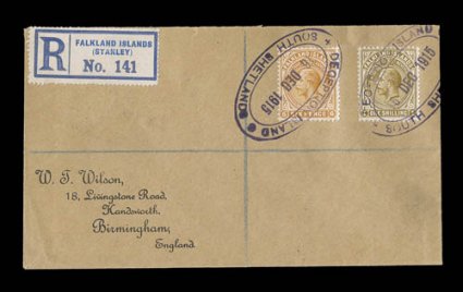 type SS.1 postmarks, with (Port) Stanley registration labels, Lo#30-33, 1912 1/2p-2 1/2p King George V, tied to W.T. Wilson registered cover to England by multiple perfect strikes of bold "Deception Island/16 Dec 1915/South Shetland" violet oval type SS.1 postmarks, with (Port) Stanley registration labels, London registry backstamp, very fine (S.G. #60-63). (Image) Est. $300-400
