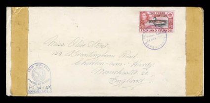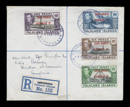 the UK in 1943 to the Antarctic to establish permanently occupied bases,Falkland Island Dependencies: Operation Tarabin, 1943-1945, a most extraordinary group of 49 covers all related and from this small British military expedition launched from the UK in 1943 to the Antarctic to establish permanently occupied bases, virtually all acquired individually at auction or retail by the current owner to one day prepare what would be, without a doubt, a gold medal level exhibition collection, nearly all are franked with the various overprinted Falkland Island Dependency issues for Graham Land, South Georgia, South Orkneys and South Shetlands, a few others are franked with stamps of Argentina, all collected for their wide variety of usages (many addressed to several of the most important "players" of the operation), frankings, markings - including scarce censor handstamps like the rare and distinctive naval tombstone censor handstamp, registration labels (including two of the rare "New Island" registration label where "New Island" is crossed off), first day usages, elusive destinations, etc.; many covers are well annotated with important historical and philatelic information, almost all fine-very fine or better; we doubt a more comprehensive collection of this Antarctic related material has ever been offered as a single lot at auction; examination a must. (imagea) (imageb) (Image) Est. $4,000-5,000
