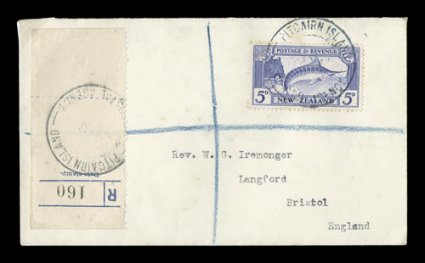 Agency large type Z1 circular cancellations, includes twelve small piS.G. #Z1/63, New Zealand stamps used in Pitcairn Islands, 1927-40, a marvelous and scarce assemblage of the various stamps of New Zealand all with "Pitcairn Island/N.Z. Postal Agency" large type Z1 circular cancellations, includes twelve small pieces with various N.Z. stamps, including four different values from the 1920 Victory series that are unlisted in Stanley Gibbons with the Pitcairn cancellation, plus there are twelve covers with a wide range of issues and usages, again all used from Pitcairn, includes two registered usages, one with hand painted design of the island all over the front of the cover, etc., all of the pieces and particularly the covers are quite elusive and desirable, with considerable retail value involved as acquired by the collector, overall fine-very fine. (imagea) (Image) Est. $1,000-1,500