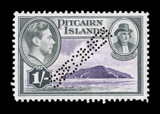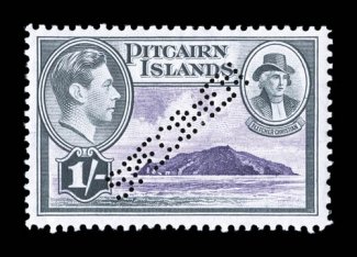 Wellington9.Ap.26N.Z. c.d.s. just below cachet, no other postal ma"POSTED AT PITCAIRN ISLAND./NO STAMPS AVAILABLE." violet two line type XI cachet (S.G. #C14), virtually complete strike on cover to Manchester, N.H., sent via New Zealand with "Wellington/9.Ap.26/N.Z." c.d.s. just below cachet, no other postal markings, some edge wear and negligible edge flaws including a small crease in top right corner just touching edge of cachet, fine and scare. (Image) £2,500
