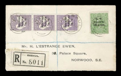 of both, with frankings ranging from 4 12p to 3- (strip of three ofNorth West Pacific Islands cover lot of seven covers, all are registered covers to England, franked with either Kangaroo overprints, King George V overprints, or a combination of both, with frankings ranging from 4 1/2p to 3/- (strip of three of 1/- Kangaroo), all stamps tied by 1918 or 1919 Rabaul pmks., covers with proper transits and receivers, fine-very fine. (imagea) (Image) Est. $500-750