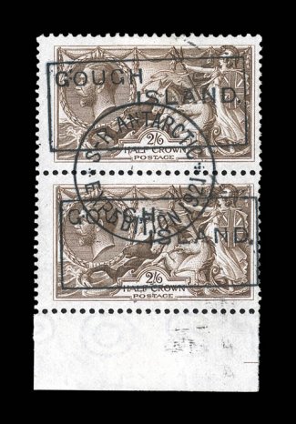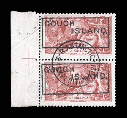 each tied to small individual piece proof examples of the box1921-22 Shackleton-Rowett Expedition, the impressive complete set of boxed "Gough Island." handstamps on Great Britain 1/2p to 10/- King George V, the 1/2p to 1/- being singles and each tied to small individual piece proof examples of the boxed cachet, as well as by central "S.R. Antarctic/8 Sp/21/Expedition 1921" c.d.s., while the rare 2/6, 5/- and 10/- "Seahorses" are sheet margin vertical pairs with undated central c.d.s. postmarks, most of the 1/2p to 1/- stamps with minor perforation toning, while the three "Seahorses' are largely very fine, the 5/- with diagonal crease; an almost impossible set to duplicate, as only 40 of each the three high value "Seahorses" are possible; ex-Jack Cole. (imagea) (imageb) (Image) Est. $1,500-2,000
