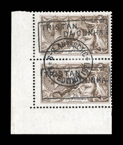 horizontal pairs and with central S.R. AntarcticMy 2522E1921-22 Shackleton-Rowett Expedition, the exceptional set of boxed "Tristan Da Cunha" handstamps on pairs of Great Britain 1/2p to 10/- King George V, the 1/2p to 1/- being marginal horizontal pairs and with central "S.R. Antarctic/My 25/22/Expedition 1921" c.d.s., while the rare 2/6, 5/- and 10/- "Seahorses" are vertical pairs with undated central c.d.s. postmarks, couple of values with small flaws (including some repairing to the bottom right of the 10/-), overall fine-very fine; an almost impossible set to duplicate, as only 40 of each the three high value "Seahorses" are possible; ex-Jack Cole. (imagea) (imageb) (Image) Est. $1,500-2,000