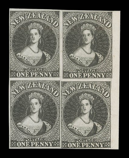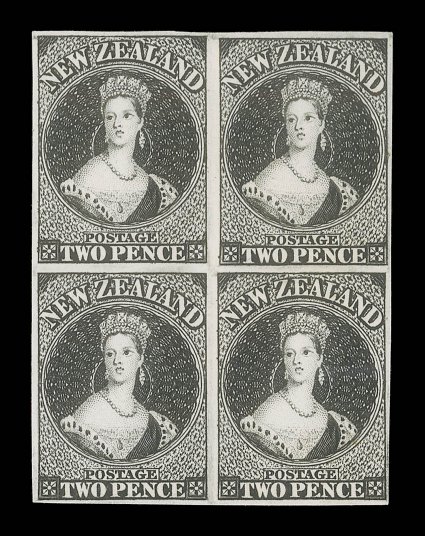 causing shadows to the letters of  new zealand , exceptional deep ri1d. dull carmine on white paper, the famous and unique horizontal strip of four, Row 11/3-6 with 3 showing pronounced re-entry and 6 showing an under-inking of the plate causing shadows to the letters of " new zealand" , exceptional deep rich color and clarity of impression and with clear to large margins nearly all round, each pair neatly cancelled "1" at Auckland; [3] with minute closed tear and [6] with upper right corner rounded, otherwise superb. One of the great rarities of the collection and considered to be one of the most important items of New Zealand philately. R.P.S. Certificates (1959 and 2001). Sc. 1; S.G. 1, £56,000+. provenance: Charles Lathrop Pack, December 1944 Alfred Caspary, October 1958 Lars Amundsen, December 1967 "Yeroc" 2000 (Image) Est. $120,000-150,000