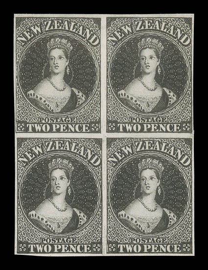inset on card (34x42mm.) showing an albino impr1d. essay in the form of a die proof, an early state showing uncleared "postage" and "new zealand" (the "z" double, one engraved in reverse), stamp-size in black on India paper and inset on card (34x42mm.) showing an albino impression of the uncleared background engine-turning. Extremely rare with only a handful of examples recorded. Holcombe Certificate (1988). provenance: Harry Lacoste Bartrop, October 1984 (Image) Est. $15,000-20,000