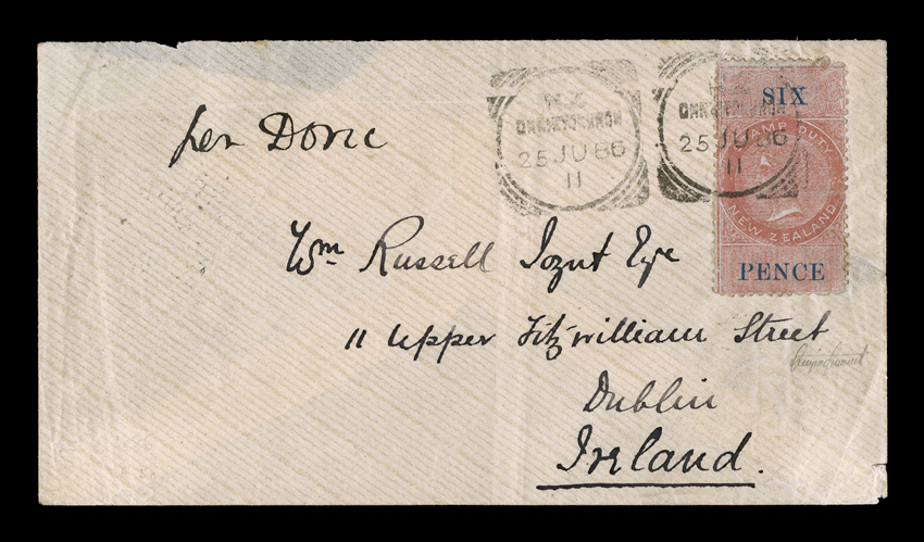 lot card, wide range of usages, includes nineteen with the early tallNew Zealand postal fiscals on cover desirable group of 39 covers mostly from the 1882-1945 period, most of which were bought individually and are still on the original auction lot card, wide range of usages, includes nineteen with the early "tall" issues, several of which are to foreign destinations, including France, Germany, England, Ireland, Tasmania, Canada, U.S. and Hawaii, some are mixed frankings with postage stamps, denominations on this issue range from 1p to 4/-, with the later issues going as high as 12/6, and a $4.00 stamp from 1987, a few WWII censored, condition a little mixed as expected, but mostly fine-very fine; an incredible opportunity to obtain a large number of scarce or rare covers at one time; eighteen are accompanied by Sismondo certificates. (imagea) (imageb) (imagec) (imaged) (imagee) (imagef) (imageg) (Image) Est. $3,000-4,000