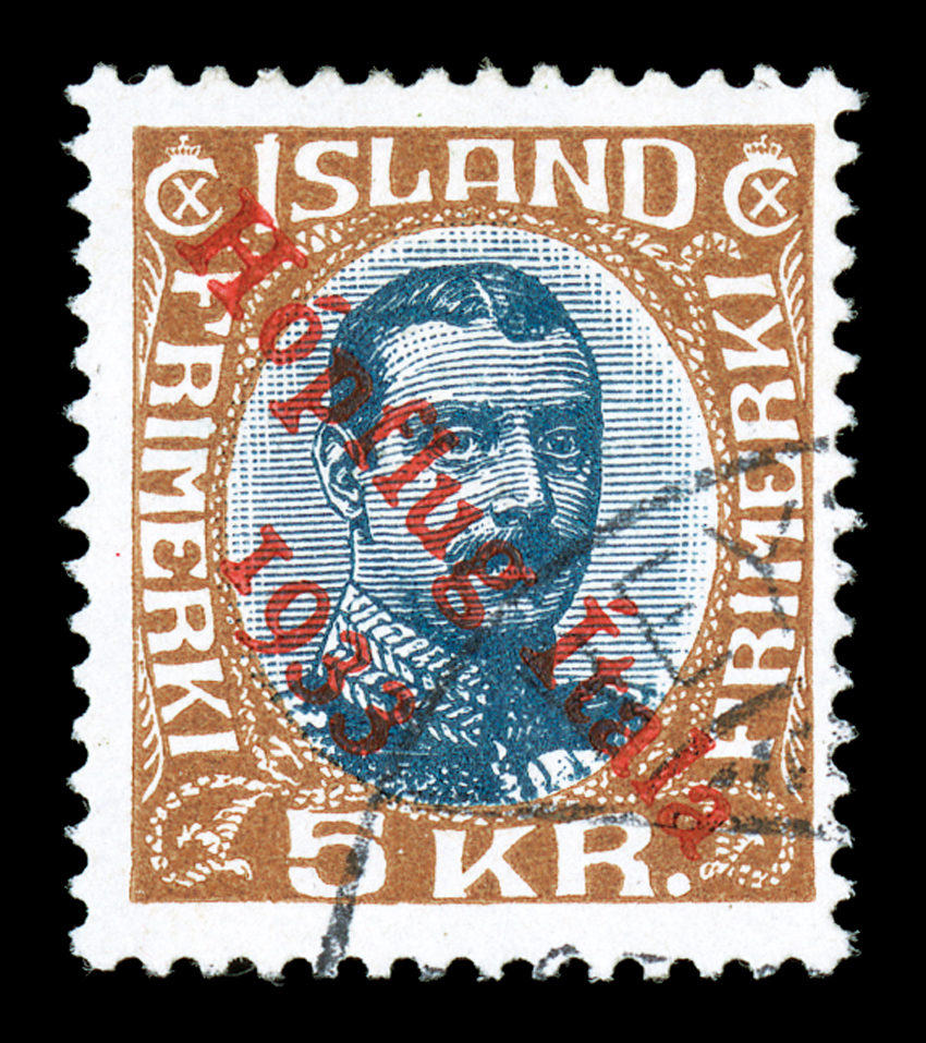 Nielsen certificate (Facit 38 SK18,000).#63, 1902 3a Orange, black overprint, perf. 14x13 1/2, bright color, neat town cancel, very fine overall; an elusive stamp that is particularly challenging to find used; 1998 Nielsen certificate (Facit #38; SK18,000). (Image) $2,100.00