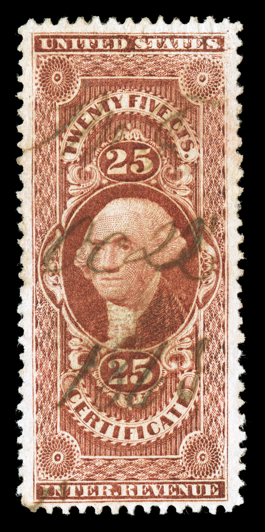 of R48 on the back, front is well centered and with deeply rich col#R44f, 25c Certificate, with Inverted Impression of 25c Power of Attorney (#R48) on back, an attractive example of this immensely rare error, showing a clear inverted impression of #R48 on the back, front is well centered and with deeply rich color, neat ms. cancel, very fine; one of the key error rarities of the First Issue, being one of only two copies recorded, the other is not as well centered and has the same ms. date cancel, so they probably emanated from the same document; listed but unpriced in Scott; 2003 PF certificate. (imagea) (Image) Est. $5,000-7,500