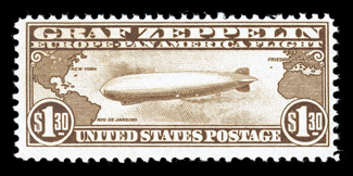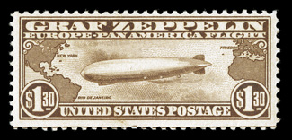 appearance.#C15, $2.60 Graf Zeppelin, top margin plate no. 20095 block of six, attractive color, o.g., never hinged, sealed tear in the top selvage, fine-very fine appearance. (Image) $12,000.00