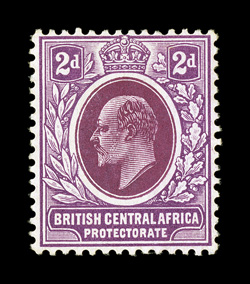 rarest of the British King Edward VII issues, both centered to theS.G. #69-70, 1907 2p Dull and bright violet and 4p Grey green and black, watermarked multiple crown and "CA", a fresh unused pair of these two values that are considered to be the rarest of the British King Edward VII issues, both centered to the top as are all known examples are, strong colors, fine; only eighteen examples of each of these values ever reached the market because the name of this country was changed to Nyasaland Protectorate at the time they were produced, of this tiny number a block of four and a single of each value reside in the Royal Collection and a single of each are in the British Library Philatelic Collections, thus no more than twelve examples are in public hands; 1990 BPA certificate for the two stamps; ex-"Sovereign" (Scott #71-72; $31,500.00). (imagea) (Image) £28,000