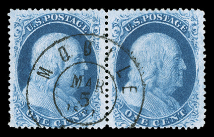 perf. at bottom left, a couple faintly toned perf. tips at right, fine#28A, 5c Indian red, Ty. I, a very rare horizontal strip of three tied to piece by 1858 New Orleans c.d.s. and French entry pmk., rich bright color, left stamp with one short perf. at bottom left, a couple faintly toned perf. tips at right, fine; ex-Ishikawa. (Image) $13,500.00