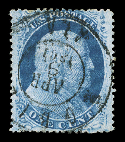 of four from which this came no longer accompanies.#24, 1c Blue, Ty. V, exceedingly well centered within wide margins, strong rich color, o.g., barest trace of hinging (if any), extremely fine; PF certificate #163902 for the block of four from which this came no longer accompanies. (Image) $170.00