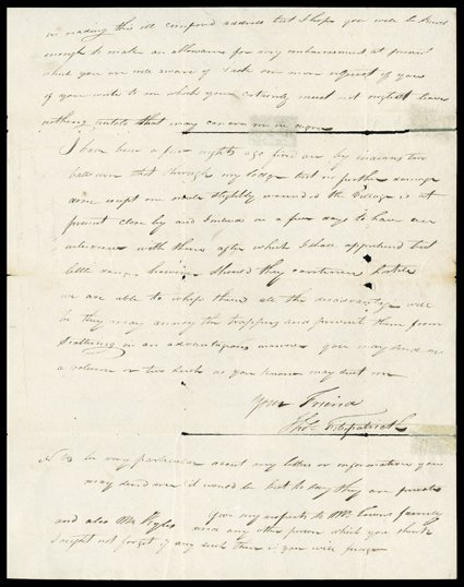 carried outside the mails, possibly to Campbell within the month when[1833 Rendezvous, Thomas Fitzpatrick] Historic Autograph Letter Signed "Thos Pitzpatrick," 3 pages, 4to, River Platte, June 4, 1833. He writes to Robert Campbell in St. Louis, carried outside the mails, possibly to Campbell within the month when the latter came up to the 1833 rendezvous bearing supplies on behalf of Campbell, Sublette & Co. He recounts his actions since the previous season:"Immediately after our separation last summer I repaired to Salmon river and there made a deposit of all our goods &c. From thence to the Blackfoot country and further north in it than a company of whites ever has been before in search of beaver but found them much scarcer than I had any idea of. Our party in that section Consisted of about 60 men...Mr. (Wm. Henry) Vanderburgh overtook us with a party of 112 men on the Dearborn river which was a great disadvantage to us altho in all they caught but about 5 packs of fur while we got 20. They remained and camped with us untill we arrived at the three forks of the missouri...I went up the Gallitin and they the Madison and soon after we both had a fight with the blackfeet. Mr. Vanderburgh was killed in a few days after we parted.""(James) Bridger was shot in 2 places with arrows...Freab starts for St. Louis this morning...We have now in our service in all about ninety men and is in 2 parties...One of 60 I have under my command in this quarter and find beaver much more plenty...I left Sublette & Jervey (Jean Baptiste Gervais) in february last on the Columbia with the 30 men. How they have done I don't Know." He asks Campbell to assist Fraeb if he meets him in St. Louis and to give James Aull his candid opinion on arranging an outfit with Fitzpatrick. He asks especially that when Campbell replies: "leave nothing untold that may concern me...I have been a few nights ago fired on by indians. Two balls were shot through my lodge but no further damage done...The village is at present close by and I intend in a few days to have an interview with them after which I shall apprehend but little danger. However Should they continue hostile we are able to whip them all." Minor fold separations. This letter gives a heretofore unknown version of the rivalry between the Rocky Mountain Fur Company of Fitzpatrick, Bridger, Fraeb, Gervais, and Milton Sublette; and the American Fur Company, employing Vanderburgh and Andrew Drips, among many others. Though Fitzpatrick does not say so, he and Bridger had been followed throughout western Montana by Vanderburgh and Drips, and appear to have purposely led them into worthless areas so that the AFC could not profit by outbidding them for their trappers. The ploy worked this year, and may have inadvertently led to Vanderburgh's death, but it was a smart game for the AFC and despite taking the loss, it soon pushed the RMF out of business. (imagea) (Image) Est. $4,000-5,000