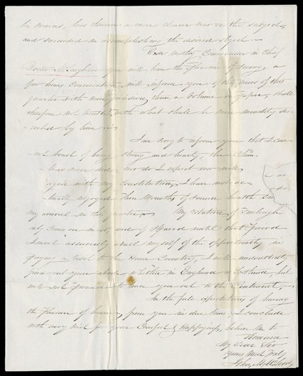 chief factor John Stuart at the Hudsons Bay House in London. With DEA[1837 Rendezvous, John McLeod] Rare content autograph letter signed by John M. McLeod, written from Fort Vancouver (near present-day Vancouver, Washington), March 4, 1838, to chief factor John Stuart at the Hudson's Bay House in London. With "DEAL / SHIP LETTER" handstamp and 1 shilling, 4 pence rate, this was carried by ship from the coast and arrived in London on October 18, 1838. McLeod explains that:"In the past summer I paid a visit to the Snake Country and according to instructions again visited that Sweet Place the American Rocky Mountain Fur Company's Rendezvouse, where for 18 days I pitched my camp in company with from 2 to 300 of the Scum of all nations...The scenes committed at that place would be beyond all description. Suffice to say many of them are of a most henious nature, but what can be expected from such a set of lawless vagabonds as assembles at that place.""You will have no doubt been made acquainted with Mr. (HBC clerk John) Hutchinson's complete failure in his attempt to Establish Dease's Lake, Summer '36...The whole appears to me a total mystery. I however hope that ere long Mr. (fur trader and explorer Robert) Campbell, who volunteered his services, has thrown a more clearer view on the subject." The Robert Campbell written of here should not be confused with the important American fur trader. He would be successful at establishing the HBC post at Dease Lake in British Columbia.The 1837 rendezvous had been held on the Green River between New Fork and Horse Creek. William Drummond Stewart and his painter Alfred J. Miller were there, as well as were Jim Bridger, Kit Carson, and Andrew Drips, three legendary mountain men. That summer McLeod had purchased Fort Hall for the HBC from Nathaniel Wyeth, and it would become one of the most important posts in the frontier. With a modern print of a US survey engraving of Fort Vancouver. (imagea) (Image) Est. $4,000-5,000