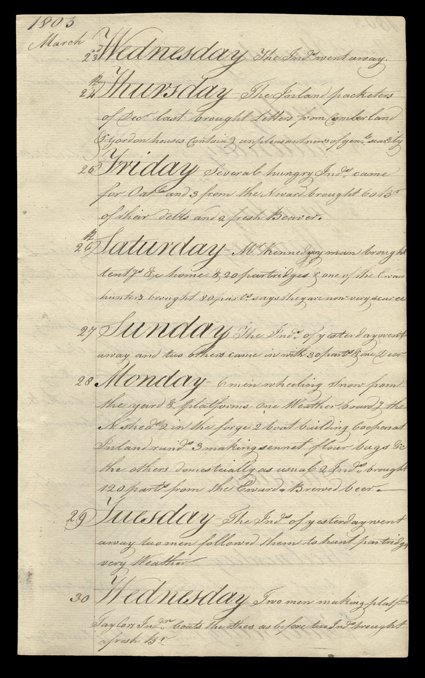 then (the third book) by John McNab, from September 20, 1801 throu[Hudson's Bay Company, York Factory Journals, 1801-1803] Extraordinary trio of manuscript diary-style journals "of Occurrences at York Factory North America" by John Ballanden and then (the third book) by John McNab, from September 20, 1801 through June 8, 1803. These recount events at the main post of the Hudson's Bay Company, and are written with the governor of the company as their intended audience. All are folio, in marbled boards. The first entry gives a sample of the type of content:"1801 Sept. / 20th Sun. - Early this morning Sent...Packet on Board Ship when at the same time Mr. Staynes went on Board as Passengers from Churchill. The wind variable Severn Brig sail'd from our launch and brought up alongside the Ship in five fatham Hole. Received a note by the return of our boat from Captain Hanwell requesting two Casks of Pease which is out of my power to grant him. Have already supplied him with a Cwt. of Biscuit and sixty Gallons English Brandy. Since receiving you Honours Packet 30 Engsh. and near three hundred Inds. has been fitted out off the Cargo sent us this year from England which has reduced our stock much."In the autumn, he hunts deer and fishes tickameg (whitefish), and Native Canadians and English hunters bring in more, some from "ten shilling Creek." As winter comes on, there is much news about the frigid weather, the freezing of the river, and illness among the men and nearby Natives. The Natives get important services from the factory, including having their guns repaired, and getting food in times of difficulty, especially if they are ill or wounded. In return they bring in deer, partridges, rabbits, skins, furs, and other provisions. He reports on March 4, 1802: "A great fall of snow all last night & this Day. Men at their various jobs excepting Daniel Henry, a labourer, which came from England last year having symtums of the Scurvey upon him which if so it must be created by indolence and not for want of fresh Provision, for his year has exceede any I have ever experien'd Since I have been in the Country for being plentifully supplied with venison and at times a Days fresh Pork & Partridge."In spring, men begin coming in with their furs. On June 11, "Mr. Tate with two large canoes manned with six Englishmen arrived from Merry's House in the Bungee Country with Beaver in good Furr." The Bungee were a group of the Saulteaux people. The arrivals and departures of men, supplies, and furs is faithfully recorded, along with the weather, deaths in camp and among neighbors, and all matters important to the smooth running of the Hudson Bay Company's vital fur trade. York Factory, first founded in 1697 (but later moved), was on the southwestern shore of Hudson Bay, at the mouth of the Hayes River. It was the central headquarters of the Hudson's Bay Company's network of factories, trading and processing posts for furs brought in by native and European trappers throughout the massive watershed of the Hudson Bay, which makes up the majority of northern and central Canada and even portions of the northern United States. The present journals are from a transition period for the factory, after the company had established satellite posts in the Canadian wilds. All books with inconsequential wear, but each fully intact and all pages legible and clean. Apparently unplublished. (imagea) (imageb) (Image) Est. $15,000-20,000
