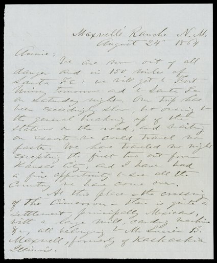stage with five other passengers. From Ft. Lyon in present-day Colora[Santa Fe Trail by Stagecoach] Three exceptional letters by "J.F.S." to Annie, undoubtedly his wife, all from the summer of 1864 along the Santa Fe Trail, which he travels in a stage with five other passengers. From Ft. Lyon in present-day Colorado, he writes that they've arrived safely after passing through the worst part of the Indian country. "We travelled up the Arkansas river 270 miles, and go 40 more before crossing and leaving it...The Indian difficulties have disturbed everything out here, so that communication with the States is almost entirely cut off...Up to this time I have not met a soul I ever saw before - all strangers; but all clever people."Three days later he is at Bent's Fort in the Colorado Territory, once the greatest fur trading post in the West: "The Indian difficulties are getting worse and worse. Just now a small squad of soldiers got here from Denver City...When about fifty miles from here they found an ambulance and wagon, and three dead men, murdered by the Indians. The party consisting of a blacksmith by the name of John Snyder and wife, and two soldiers...on their way to Fort Lyon when they were surprised by about forty Indians. The men were killed and the woman carried off. Several arrows were still sticking in the dead bodies...These murders are becoming a daily occurrence, and the whole country is terror-stricken...The bushwhackers have been very bold in this region this summer. Their leader was recently captured...His name is Jim Reynolds - son of old Tom Reynoldes...whom I knew well years ago. He will be shot."By August 24, they reach Maxwell's Ranch in New Mexico: "We are out of all danger and in 150 miles of Santa Fe...Our trip has been exceedingly slow...We traveled no night excepting the first two out from Kansas City...At this place - the crossing of the Cimerron - there is…(a settlement, with) a large mill, carding machine, etc., all belonging to Mr. Lucien B. Maxwell, formerly of Kaskaskia, Illinois." All are in nearly flawless condition. (imagea) (Image) Est. $750-1,000