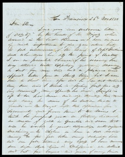 with San Francisco, Cal.Dec 31 datestamp and matching boxed 40 rSacramento River Steamer Senator Dec. 21, 1849 25 miles from San Francisco 2 O.C. P.M. dateline on folded letter with integral address leaf to Waterbury, Ct., entered the mails with "San Francisco, Cal./Dec 31" datestamp and matching boxed "40" rate handstamp, very fine.The following is taken from the letter written onboard the Senator by Merit Welton. He writes regarding mail from home and sending Gold: "The last remittence was Sixty two & a half ounces worth $1000 here & I am in hopes 1200 or 1300 there - I paid $70 freight & Ins[urance]. I shall write every opportunity & send money when I can send safe....I have travelled from Sutters Mill to Sacramento City which stands on the Sac. River 100 miles above S. Francisco....The roads are almost impassable....It rains almost every day & 20 miles feuther North it snowes as the Mts are all white & and do not look over 10 miles from the Mill....San Francisco Dec 28th 1849 2 O.C.P.M.- I went to the [Post] Office as soon as arose this morning & being there an hour before it opened I was the 4th man & obtained 6 letters....I cannot get letters without Ceruesy [Currency] here & then spending half a day at the P.O.....The people up in the revines would gladly pay 1 Oz of Gold a letter if they could have them on the arrival of the mail here or in one week afterwards but they cannot & it is all luck & chance about getting any letters here, even by applying at the P.O. & waiting your turn. The mud here is very bad - you cannot possibly go out without being in the mud (which is excellent clay Morter) about 4 or 5 inches - by picking round & going between Houses & back side & in the middle of the street it is up to a Horses belly. There has been a fire here which has burned up one Block of some Millions of Dolls but the speed with which they are putting it [back] again [is like] N. York for dexterity....Merit Welton"The Senator was one of the best known steamboats to operate on the Sacramento River during the Gold Rush period. It was a sidewheeler of 740 tons, with auxiliary sail, built at New York in 1848. On 10 March, 1849 she left for San Francisco via cape Horn, arriving in that port on 27 October. She was immediately put into service on the San Francisco - Sacramento River run. (Image) Est. $500-750