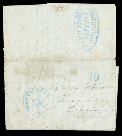 516 c   [Vigilance Committee, Sonora] Sonora, California, Nov, 25 1851 well struck blue two-line straightline postmark on folded letter with integral address leaf to New Lisbon, N.Y.,
