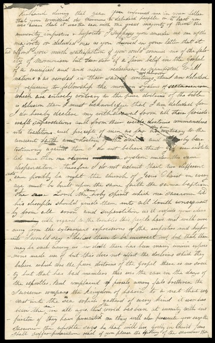 Home Missionary Society, in New York. The first, from Dubuque, Iowa[The "Destructive influence of Mormonism"], Nauvoo. Interesting content pair of letters by Presbyterian missionaries in Iowa to Rev. Milton Badger, the secretary of the American Home Missionary Society, in New York. The first, from Dubuque, Iowa Territory, April 5, 1842, is by John C. Holbrook. He complains of "the destructive influence of MORMONISM. Every minister knows that whenever God's people are revived, & put forth special efforts for the salvation of sinners, then the Devil stirs up his instruments to promote a revival of his work. Sometimes he uses Universalists; sometimes Infidels, & sometimes the Mormons."A Mormon had been interrupting the missionary's prayer meetings, addressing the congregation "to enlighten them in the mysteries of that system, & with the revelations" said to have been vouchsafed to Joe Smith, the prophet of 'the latter day Saints.'" The man had come to the mission for enlightenment, but it seems that Holbrook's doctrines could not attract him, for he would announce at the close of meetings that "There will be preaching...by one of the Elders of Israel, commonly called Mormons." Holbrook especially despises the doctrine that "literally NOW, 'signs shall follow them that believe,' &c., 'they shall speak with new tongues - shall lay hands on the sick & they shall recover' & that these are the evidences of real faith. They profess to perform these miracles." He goes on to complain in less indignant terms about competition from Catholics. Emendations throughout in ink show that this letter was adapted for use by the Missionary Society in one of its publications. Bottom fourth cleanly detached, with partial splits at other folds. The second letter, by J.A. Clark, Fort Madison, Iowa Territory, December 6, 1842, complains of the difficulty creating a lasting community on the frontier, but boasts that Clark's church has doubled in size. However, he must make "a very important point. I know of none in the territory more so & that presents more flattering prospects for ministerial success. The beast has already looked upon it with a covetous eye & Lieutenant Genral prophet Joe arrogantly claims it as his." He explains that the spot is below the rapids, where steamboats can visit longer into the cold season than points further north (presumably including Nauvoo). Fold wear including minor splitting. With a "Fort Madison / i.T." postmark. (imagea) (Image) Est. $500-750