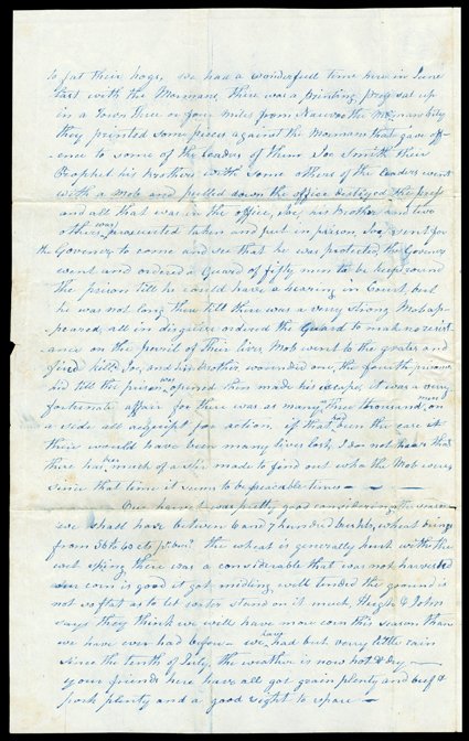 NJ, about rains and flood that have devastated the area, with Every th[Death of Joseph Smith] Uncommonly sober content letter by John L. Cross of Jerseyville, Illinois, September 6, 1844. He writes to his son, John C. Cross, in Somerset County, NJ, about rains and flood that have devastated the area, with "Every thing destroyed, a great many good Houses & Barns...swept of, their crops of every kind gone with all fruit trees, the best of Orchards destroyed, their fences entirely swept of...their stock chiefly drowned." It seems Cross has escaped the worst of it. However, "We had a wonderful time here in June last with the Mormans. There was a printing press sat up in a town three or four miles from Nauvoo, the Mormans City. They printed some pieces against the Mormans that gave offence to some of the leaders of them. Joe Smith their Prophet his Brother with some others of the leaders went with a mob and pulled down the office, destroyed the press and all that was in the office. Joe, his brother, and two others was prosecuted, taken and put in prison. Joe sent for the Governer to come and see that he was protected. The Governer went and ordered a guard of fifty men to be kept round the prison till he could have a hearing in Court, but he was not long then till there was a very strong Mob appeared, all in disguise ordered the Guard to make no resistance on the perril of their lives. Mob went to the grates and fired. kill'd Joe, and his Brother, wounded one (John Taylor),the fourth prisoner (Willard Richards) hid till the prison was opened then made his escape. It was a verry fortunate affair for there was as many as three thousand men on a side all acquipt for action. If that had been the case there would have been many lives lost. I do not hear that there has been much of a stir made to find out who the Mob were. Since that time it seems to be peaceable."Seal hole affecting three lines on first and third pages (not near Smith content); light edge and fold wear. According to most accounts of the attack on the Carthage Jail where Joseph and Hyrum Smith were being held, the attackers blackened their faces to disguise their identities. Upon surrendering to authorities, Joseph had said that he was going "like a lamb to slaughter," but it did not prevent him from concealing a pistol that he reportedly used to defend himself. Some versions say he was shot in the back while in others he jumps out his cell window to his death. The uninjured Richards apparently hid behind the heavy cell door when the mob forced it open, and fled once they dispersed. (imagea) (Image) Est. $1,500-2,000
