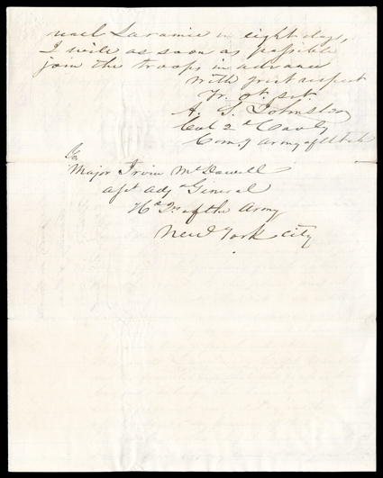 document signed by Johnston and by Jesse L. Reno. Johnston had been sen[The Utah War, Albert Sidney Johnston], An incredible group of six letters, three entirely in Johnston's hand, 1857-58, while a colonel commanding the Army of Utah; with one document signed by Johnston and by Jesse L. Reno. Johnston had been sent west in response to complaints about the near-theocratic control over the Utah Territory exercised by Brigham Young, head the leaders of the Church of Jesus Christ of Latter-day Saints and also governor of the territory. President James Buchanan appointed a new governor, Alfred Cumming, to reinforce US authority there, and dispatched Johnston with 2,500 troops to act as a posse comitatus to keep the peace upon his arrival. In the first letter, from Fort Kearny, Nebraska Territory, Johnston writes Assistant Adjutant General Major Irvin McDowell that he has just arrived from Ft. Leavenworth after a seven-day march. He is glad to report that: "There is no indication of an early winter. Beyond Laramie, Capt. (Stewart) Van Vliet writes from Red Buttes that the grass is bad beyond belief. Every thing thus far encourages the belief that there will be no failure of any portion of the troops destined for Utah." (Van Vliet had been sent ahead to try to smooth matters with Brigham Young, but was unsuccessful.) In the next letter, from "Camp on the three crossings of Sweet Water, 13 Octr. '57," he writes to McDowell that he has sent couriers to Col. Edmund Alexander, leading a column far to his rear, and "From them I learn that the Mormons having interposed a force in rear of our troops, then encamped at Hams fork of Green River, succeeded in burning three supply trains with their contents. Message from Col. Alexander was sent by them to Col. CF Smith instructing him to protect the trains in the rear. … leaves Col. Smith with only 22 men; 47 men of his command were left at Laramie as part of the Governor's escort. We will march in the morning and expect to encamp with Col. Smith tomorrow night. Col. Alexander is trying to reach the Valley of Salt Lake by the Bear River … I would direct him to take up a good position for the winter at Hams fork. The road is beset between this & Hams fork with companies of Mormons." With McDowellís forward to the Secretary of War on verso of last page. Five days later he sends a letter to McDowell from the "South Pass - En route to Salt Lake City" enclosing two letters from Alexander (not present) in which the latter questions his own authority to command. Johnston says Alexander's authority "is clearly granted by the 62d. Article of War … in the absence of Genl. Harney … " Alexander has not halted as Johnston advised, and evidently believes that Col. Smith is advancing on the Kinney "you are already apprised, by the proclamation of Brigham Young of the political attitude assumed by the Mormons and the resistance they meditate The General in Chief no doubt has already considered the necessity of a conquest of those traitorous people."On December 13, he writes in holograph to McDowell from Camp Scott, near the site of an older fort (Bridger) that the Mormons had burned. "Two additional companies of volunteers have been mustered into the service of the United States for nine (9) months.' .." He is now "anxious for the certain and safe transit of supplies for the army in the spring .." The winter of 1857-58 was difficult for the soldiers at Camp Scott. Sent into the wilderness so late in the season with such an unreliable supply line, his men nearly starved and froze. Meanwhile, backchannel negotiations eventually convinced Brigham Young to relinquish his governorship and accept Cumming. Still distrustful of the army, Young and his followers abandoned Salt Lake City, hiding in the mountains to the south until it became clear that there would be no violence. On April 22, 1858, from Camp Scott, Johnston sends McDowell a letter from Governor Cumming (not present) "in which he announces that he has been received and recognized as Governor of Utah." He presumes this means the Mormon militia will disperse, but "three days since they were still encamped in the Canyons on the route to the city, in considerable force. I send copies of the Deseret News (not present). You will see the effort the editor makes to inflame the people against the Army." With autograph endorsement on blank integral page by Commanding General Winfield Scott. The last letter, from Camp Floyd on November 2, 1859, he writes Assistant Adjutant General Lorenzo Thomas in New York about Maj. Isaac Lynde's expedition, protecting emigrants passing through the territory to California, Washington, and Oregon. All the same, "three parties were robbed and ten or twelve of their members, comprising men, women, and children, murdered; one of these parties was plundered before and two subsequent to the arrival of the troops. The perpetrators of the robbery of the first party were severely chastised" though the others were not found. "They are supposed to be vagabonds from the Shoshones or Snake and Bannack Indians. There is abundant evidence to prove that these robber bands are accompanied by white men and probably instigated and led by them. These bands are composed of vicious tools in the hands of worse white men."Finally, Johnston endorses a 3½ page estimate of ordnance stores for the Department of Utah for the next two years, submitted by Jesse L. Reno, then a brevet captain of ordnance. It includes 12 barrels of .58 caliber rifled muskets, with the necessary ball screws, bullet moulas …. All letters have minor faults, a few small pieces missing, and two with clean hinge separations not affecting text. With Map between Fort Leavenworth and the Great Salt Lake. NY, Ackerman Litho., 1850.Johnston, Albert Sidney - American soldier who fought under the flags of the Union, the Republic of Texas, and the Confederacy (1803-62); considered by many the greatest general in the South at the beginning of 