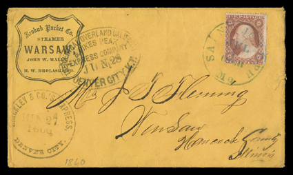 orange cover with 3c Dull red (26) to Gratiot, Wisconsin, entHinckley & Co.'s Express, Denver City, Jun 2, 1960, mostly clear handstamp and oval "The Central Overland California/& Pikes Peak/Express Company/Denver City K.T./June 2" handstamp on orange cover with 3c Dull red (#26) to Gratiot, Wisconsin, entered the mails with blue "Saint Joseph, Mo./Jun ?, 1860" postmark tying the stamp, bottom backflap missing, still a very fine conjunctive use.The Hinckley Express was established by C.S. Hinckley and John A. Sowers early on May 31,1860. They operated between the mining camps in the gold region and Denver. At Denver they connected with the Western Stage Company as well as the Central Overland California & Pikes Peak Express company. (Image) Est. $500-750