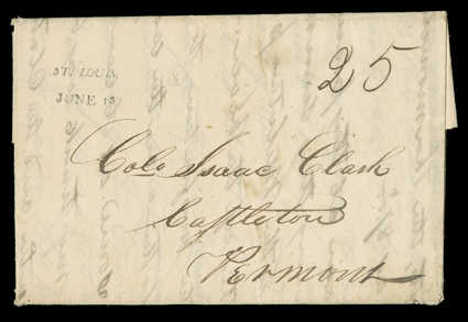 Missouri Rivers), February 16, 1821. Both are to his father in Castleto[First Steamboats on the Missouri] Pair of autograph letters signed by Lt. Isaac Clark, St. Louis, June 11, 1819, and Belle Fontaine (at the confluence of the Mississippi and Missouri Rivers), February 16, 1821. Both are to his father in Castleton, Vermont. The first has a June 13 straight-line St. Louis postmark, and the second a circular February 17 "St. Louis Mo. T." postmark; both are rated at 25 cents. In the first, he complains of government agents, for "not a particle of provisions or stores...were to be found in this place on my arrival destined for that [Missouri] expedition...I have succeeded so far in procuring stores as to be able to start the Rifle Regiment, in two days more. The 2nd Regt will follow in about fifteen days. The Missouri is a grand & noble stream but the difficulty in navigating is almost insurmounable...The 2nd Regt will go in steamboats if it is possible. Their calculation is to go to Council bluffs this season 250 miles from this & about 400 miles above any settlements. I am now trying to contract for one hundred head of cattle." He also gives an account of the bustling and overpriced young town of St. Louis.In the second letter, he has not received or sent mail because "the country has been almost inundated between this & Vincennes one hundred & Eighty miles...I view this climate as very unfavorable to persons subject to Billous habits and in fact to any person bred in the frozen regions of the North...I shall never enjoy good health again...General [Henry] Atkinson...has placed me in command of this post...It gives me double rations and I also draw the additional pay of asst Commissary. I have been entitled to promotion from March last...Should the Army not be reduced I shall leave this post in March for the Council bluffs...We shall ascend the river in Boats...against the strongest current in the World." The expedition in question, under the overall command of Gen. Atkinson, attempted to ascend the Missouri River to the Yellowstone. The current defeated their efforts and they had to turn back at Cow Island, near present-day Atchison, Kansas. It would not be until 1831 that a steamboat was able to ascend beyond Council Bluffs to the Yellowstone. (imagea) (Image) Est. $500-750