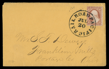 Pacific R.R.Nov 22 route agent postmark, slightly reduced at left, very f[Wells Fargo to Central Pacific Railroad] 3c Green on amber entire to Wings Station, N.Y. with Wells, Fargo & Co. printed frank, entered the mails with well struck "Cent. Pacific R.R./Nov 22" route agent postmark, slightly reduced at left, very fine; this was the western division of the transcontinental railroad from Ogden, Utah to San Francisco. (Image) Est. $300-400