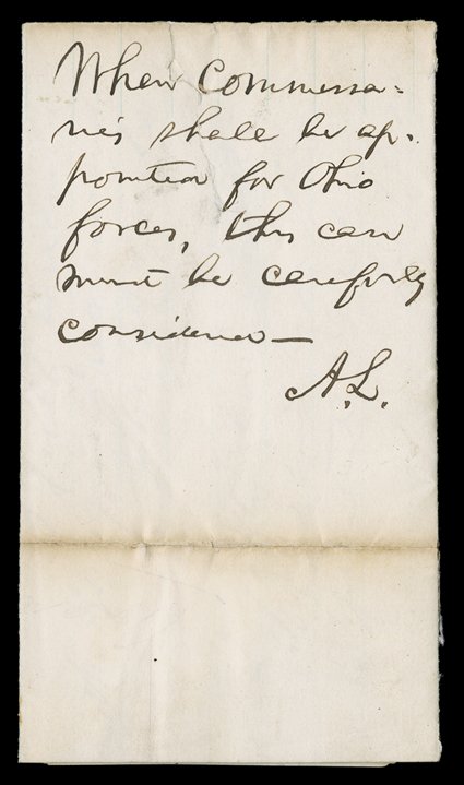 Swayne of Columbus, Ohio, who has written to Secretary of War Simon Camer[Abraham Lincoln, Ohio forces] 1861 Autograph Note Signed "A.L." on verso of the blank integral page of an Autograph Letter Signed by (future Supreme Court Justice) Noah H. Swayne of Columbus, Ohio, who has written to Secretary of War Simon Cameron, "Mr. A. V. Barring of this place has been appointed commissary to Gen. Schleighs brigade of Ohio Volunteeers. He has warned that the appointment to be of any validity must be made by you. I can commend him as a gentleman of energy intelligence worth and high character." Endorsed at close by Henry B. Carrington, former adjutant general of Ohio, John A. Gurley, US Senator "B.F. Wade" and US Representative "John A. Gurley."President Lincoln, crushed by the rush of office-seekers just three months after taking office, writes simply and without committing himself, "When Commissaries shall be appointed for Ohio forces, this case must be carefully considered." Closed tear passing through first three lines of note but not affecting legibility. Age-toned, with notable fold wear including partial separations, some reinforced with paper. A curious request, as we cannot find any record of a General Schleigh. Possibly he had failed to raise the brigade he had hoped to form in the patriotic excitement of the war's first weeks. Early in 1862, Lincoln would appoint Swayne to the US Supreme Court; Swayne was replacing his own mentor, the late Justice John McLean. (imagea) (Image) Est. $1,500-2,000