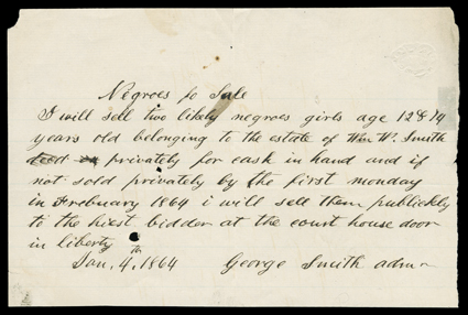 announcement by George Smith, reading: Negroes fo [sic] Sale  I will sel[Slavery, 1850/1860s] Choice group of five items: three are Louisiana bills of sale for slaves, two of them on partly printed forms, with a Civil War-date manuscript announcement by George Smith, reading: "Negroes fo [sic] Sale / I will sell two likely negroes girls age 12 & 14 years old belonging to the estate of Wm. W. Smith dec'd privately for cash in hand and if not sold...by the first Monday in February 1864 i will sell them publickly to the hiest bidder at the court house door in liberty. Jan. 4th 1864." With a partly printed estimate for "Slaves, furnished to the Confederate States for service on the Coast," four men whose combined value is $14,700. (imagea) (Image) Est. $750-1,000