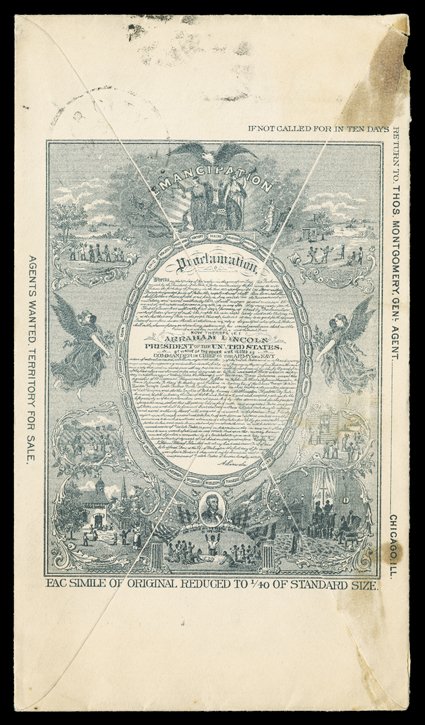 Negroes Consigned, addressed to Athens, Tennessee with 3c Dull red (26)[Slave Auction Illustrated Cover] Dealer in Negroes, Will L. Boyd, Jr., General Agent, Nashville, Tenn., striking illustrated advertising cover with "Cash Advances Made on Negroes Consigned," addressed to Athens, Tennessee with 3c Dull red (#26) tied by blue "Nashville, Ten./Jun 25, 1858" datestamp, cover with small repair at top just affecting the design with a tiny portion of design drawn in, otherwise extremely fine; the only known illustrated slave auction advertising cover; illustrated in Alexander; ex-Antrim, Hart. (Image) Est. $7,500-10,000