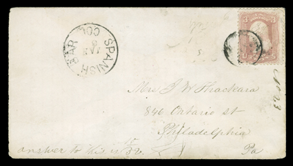Lawrence, Illinois with 3c Rose (65) cancelled by pen strokes, the othSpanish Bar, Colorado Territory, two territorial period postmarks, first manuscript "Spanish Bar C.T./Dec 23rd 64" on orange cover from the Shaver gold rush correspondence to Lawrence, Illinois with 3c Rose (#65) cancelled by pen strokes, the other with "Spanish Bar, Col./Jan 6" datestamp on cover to Philadelphia with 3c Rose (#65) tied by target cancel, former slightly reduced at left, very fine. (imagea) (Image) Est. $300-400