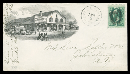 (158) and West Los Animas, Col.Apr 5 datestamp, the other with a[Colorado illustrated covers], two handsome advertising covers from the 1870's, one for Prowers & Hough, Forwarding & Commission Merchants showing their store used with 3c Green (#158) and "West Los Animas, Col./Apr 5" datestamp, the other with allover back design for Chick, Browne & Co., Commission & Forwarding Merchants used with 3c Green (#147) and "Granada, Col./Aug 21" datestamp to Mora, N.M., latter slightly reduced at right, very fine. (imagea) (Image) Est. $500-750