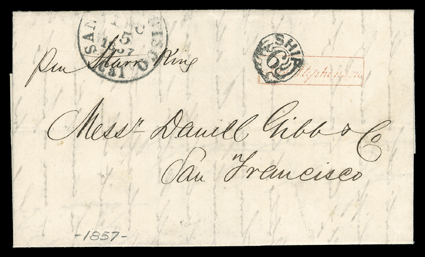 Jackson directive, entered the mails with San Francisco, Cal.Kate Hooper, cover to San Francisco forwarded with red boxed "Jas. Stephenson/Commission Merchants/Hong Kong" handstamp and with manuscript "Pr. Clipper Ship, Kate Hooper, Capt. Jackson" directive, entered the mails with "San Francisco, Cal./5 May" datestamp and matching clamshell "Ship/6" handstamp, very fine.Kate Hooper was a medium ship of 1,488 tons built by Hunt & Wagner at Baltimore for J.J. Hooper in 1852. Captain John J. Jackson was her first commander until about 1862. If the pencil "1853" date is correct, then this cover must have been sent on the return voyage from her first trip to China. The following copy is from "American Clipper Ships" by Howe and Matthews, 1926, Salem, Mass.: "Late in 1857, her freight of 600 coolies, bound from China to Havana, mutinied and several times tried to take possession of the ship before Anjer was reached. After leaving Gaspar Straits they had control of the 'tween decks and had fired the ship in three places. The officers restored order after shooting four and hanging one of the Chinamen. Captain Jackson was sick at the time and on Nov. 23rd asked a Dutch man-of-war to tow his ship into Melbourne. On arriving at Havana, the crew mutinied and the vessel was detained 11 days. The ringleaders were sent to the United States to be tried."The Hooper, under Captain Johnson, sailed from Hong Kong, Oct. 28, 1862; passed Anjer, Nov. 16th, and arrived at Melbourne, Dec. 15th. On the 29th, while lying in Hobson's Bay, she was discovered to be on fire. About 300 tons of cargo had been discharged into lighters, leaving 1500 tons still aboard. She was scuttled in 18 feet of water and burned to the water's edge. The fire was believed to have been set by a Chinese member of the crew. The vessel and cargo was sold for £2,400 to Bright Bros. of Melbourne. She was raised, repaired and rigged as a bark and under the name Salamander, of 929 tons, as rebuilt, was registered as late as 1871, owned as above, and commanded by Captain Hudson. Her name does not appear in registers of 1874. (Image) Est. $750-1,000