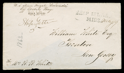 1215 c   U.S. Navy covers, letters and correspondences, over 55 covers and over 45 letters (most often the cover with the original letter), principally from the 1860's, being largely the correspondence of George H. White, a member of the Engineering Corps of the U.S. Navy, written while on board the Colorado and the Nantucket while in the Gulf of Mexico during the Civil War, an later on the Pacific coast while on board the Resaca, the naval ship that carried the Commission to Sitka, Russian Alaska to negotiate the sale and transfer of Alaska from Russia to the U.S. in the spring of 1867, also many Basford correspondence covers written from Acapulco while on board the White Falcon, plus a range of other naval cover including Wachusett, Winona, Hartford, Pawnee, Jamestown, Alaska and others, nice range of ship and steamship markings and rates, some usual faults, largely fine-very fine, many with interesting and historical contents. Est. $3,000-4,000