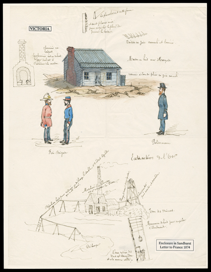 enclosure partially colored, showing a typical house with side details[A Frenchman visits the Outback], Victoria 1873 2d Violet (#135) and 1867 6d Blue (#116) tied by "Sandhurst/Se 9, 74" duplex postmark to cover to Pairs, with hand illustrated enclosure partially colored, showing a typical house with side details of fireplace and roofing, drawings of two different firemen, a policeman and a detailed diagram of the workings of a gold mine, plus the letter in French with a drawing of an aborigine, cover handstamped "Insufficiently/Paid" in London and charged "19" decimes due on arrival in Paris, six backstamps, cover edge flaws, still very fine and attractive. (imagea) (Image) Est. $750-1,000
