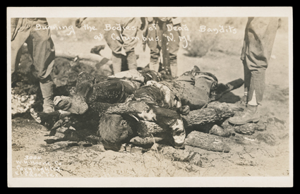 Pershing sought to capture Mexican rebel leader Pancho Villa after some raid[Pancho Villa Expedition] Excellent group of photographs, most of them period postcards from the border clashes between US forces and Mexican rebels in 1917 as Gen. John Pershing sought to capture Mexican rebel leader Pancho Villa after some raids on American border towns. With many photographs of Villa and his men, and quite a few of US Soldiers and Mexican regulars. 69 postcards in all, including about a dozen or so that are unrelated but from the same period. Quality is uniformly excellent. Some images not for the faint of heart. (imagea) (imageb) (Image) Est. $300-400
