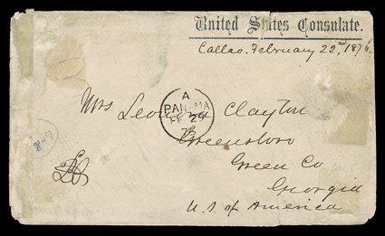 1276 c   [From Peru, United States + Great Britain Mixed Franking] United States Consulate imprint cover, manuscript Callao Oct 5 1876 endorsement, with pair of Great Britain 1873 6p