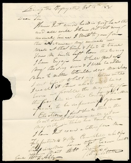 165   Sublette, William L., Choice political content autograph letter signed to William H. Ashley, Lexington, MO, October 16, 1831. Returning from Santa Fe, he reports:I have not