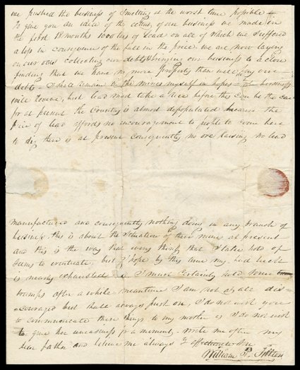 addressed to Washington, DC. Tillton writes to his father, Daniel, in LeeTillton, William P., Exceptional content autograph letter signed from Galena, IL, March 24, 1830. Leaf is postmarked and rated 25c, forwarded with additional 10c due, it is addressed to Washington, DC. Tillton writes to his father, Daniel, in Leesburg, Virginia:"It may seem strange to you that after residence of Eleven years in this western country...risking my life & health for gain that I should still be so poor, but such is the fact and to account for it I will give you a sketch of...the last Eleven Years. The first 3-1/2 years I spent in St. Louis as a clerk principally in an auction house...I received a salary for my services of $400 and board, this just about paid my expenses...I associated myself with five other young men like myself, obtained a credit for about $20,000 worth of Indian goods and went into the Indian country.""In this business I spent five years returning every spring to St. Louis with my peltries for supplies. We traded on the Upper Missouri as high as the Yellow Stone - on the Upper Mississippi above the falls of St. Anthony and up the St. Peters to its source...The last year we returned to St. Louis, furs and peltries to the amot. of $90,000, yet...we wound up our business at the end of five years with a loss of $2000 per share, this was owing to the great opposition in prices we had to contend with in the Am. Fur Co. together with a loss in one Spring...by the rise of the Missouri River of about $10,000. I settled my $2000 by a note of hand due now in two years...Forming a co-partnership with a Mr. (Lemon) Parker came to Fever River (Galena) about 2-1/2 years ago and my usual bad fortune has attended me here...in consequence of the great...depreciation to the price of Lead."The Columbia Fur Company had been formed by Tillton with former employees of the Hudson's Bay and North West Companies who had been displaced when those two companies merged. Astor bought them out in 1827 and their territory became the Upper Missouri Outfit of the American Fur Company. Tillton had been president of the CFC because many of his partners were Canadians and thus barred from trading with Native Americans in the United States. (imagea) (Image) Est. $1,000-1,500