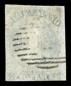 fine appearance. Sc. 22 S.G. 83, £800.2d. pale ultramarine with good to large margins all round and showing trace of adjoining stamp at upper right, cancelled "9" at New Plymouth; small thin towards top though of fine appearance. Sc. 22; S.G. 83, £800. (Image) Est. $300-400