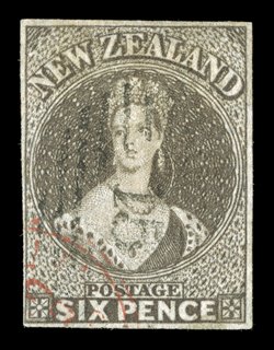 at top and soiled in places, all of minimal consequence when one cons3d. lilac, unused without gum, clear to large margins all round except at upper left, of fresh bright color and of striking visual appearance; crease at lower left corner, thin at top and soiled in places, all of minimal consequence when one considers the importance and calibre of this delicate stamp. An outstanding and beautiful looking example of this highly prized and hugely important stamp, of which only two examples are recorded. One of the most important stamps in the Joseph Hackmey collection which has been lacking from so many of the great collections of New Zealand, and one the rarest of all British Commonwealth classic issues. Friedl (1976) and Holcombe (1991) Certificates. Sc. 23; S.G. 84, £50,000. provenance: Mann, Harmer, Rooke & Co., October 1933, "Samos, June 1991,"Antipodes", October 1988 (Image) Est. $40,000-50,000