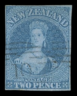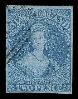 single, all cancelled 11 with two of the 2d. values additionally tied1859 (22 July) envelope from Ahuriri "via Marseilles" to London, bearing 1d. red with sheet margin at right in combination with 1857-63 2d. pale blue strip of three and a single, all cancelled "11" with two of the 2d. values additionally tied by London Paid c.d.s. (16.10), fine despatch c.d.s. on reverse; the 1d. creased prior to use and the 2d. values with a few defects, nevertheless a remarkable mixed issue franking and the only recorded example of a single 9d. rate "via Marseilles" letter being paid in stamps prior to the August 1859 introduction of the 6d. stamps. R.P.S. Certificate (2006). Sc. 4, 8; S.G. 4, 10. provenance: John Woolfe, 2006 Note: Although marked and paid to go "via Marseilles" the cover appears, from the London datestamp, to have been sent "via Southampton". The "via Marseilles" mail arrived on 7 October. At this date only 1d., 2d. and 1/- stamps were available and a minimum of five stamps were needed to make up the 9d. rate. (Image) Est. $4,000-5,000