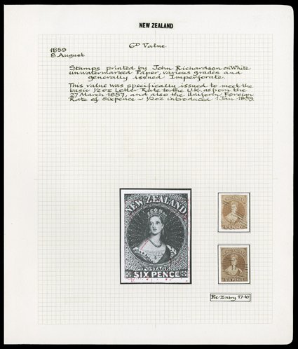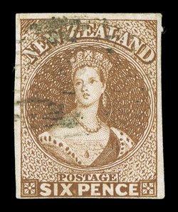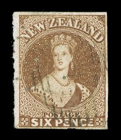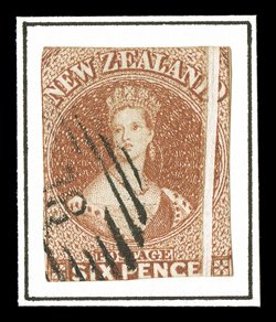 6d. chestnut on hard paper, good to large margins and clearly cancelled "18" at Otago; tiny patch of discolouration at upper right corner, otherwise sound. Sc. 9f; S.G. 15, £550.