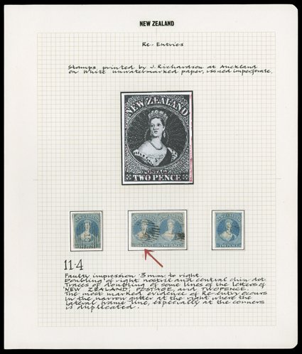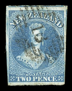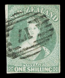 1/- emerald-green on soft paper, showing dry ink impression at right, good to large margins, neatly cancelled "1" at Auckland, good colour and fine. Holcombe Certificate (1985). Sc. 10a; S.G. 16, £1,700. (Image) |